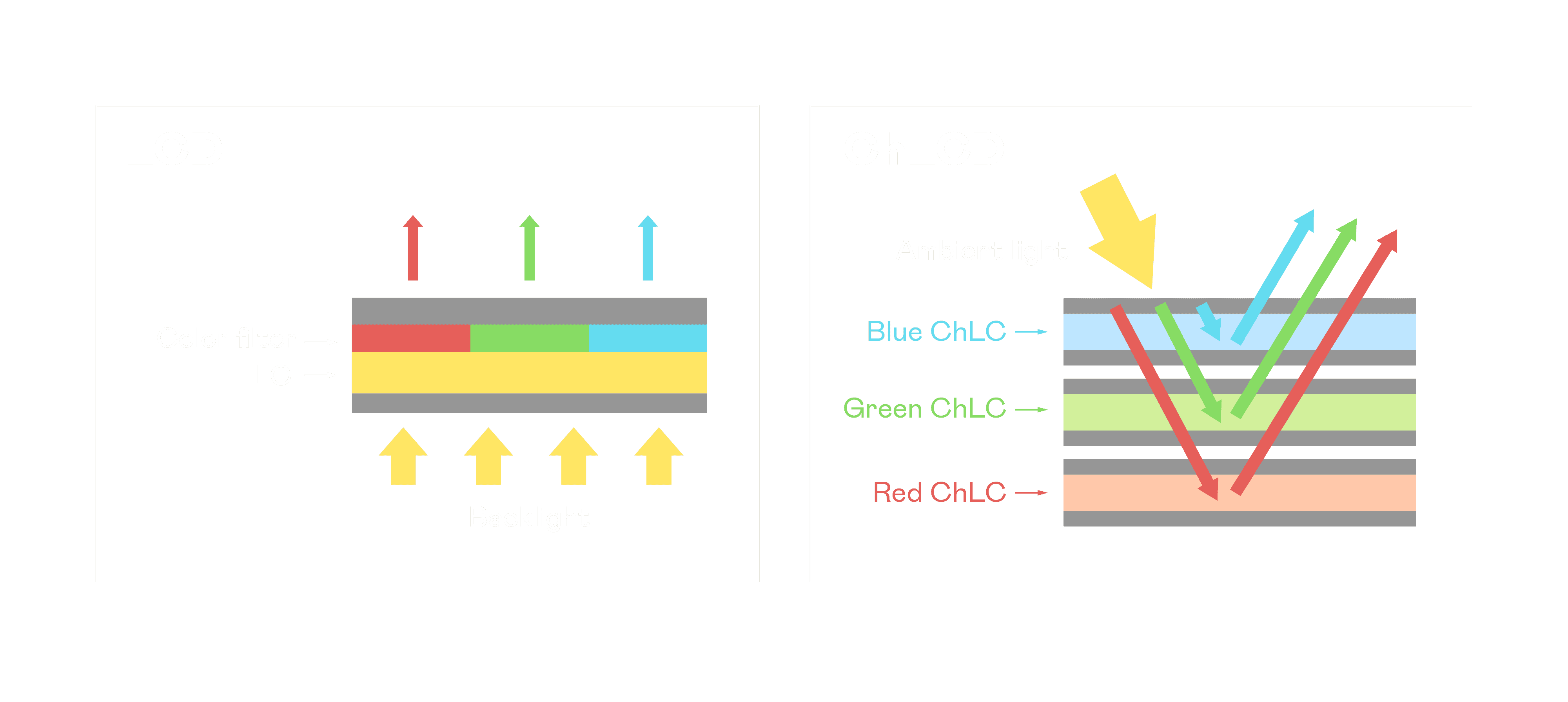 2468BET胆固醇液晶显示器是由红、、绿、、、、蓝三层胆固醇液晶面板堆叠而成,,,,并采用无彩色滤光片设计,,,,减少环境光在反射过程中的损耗。。